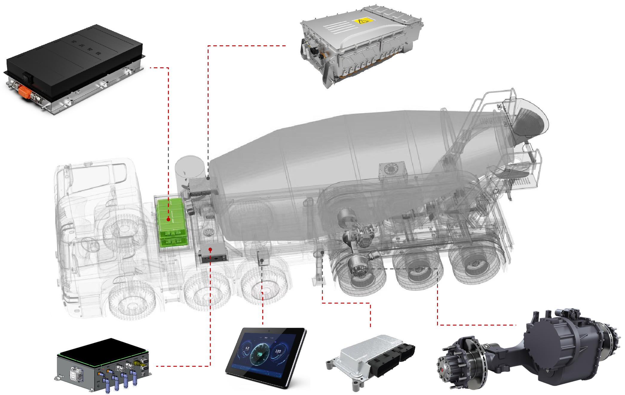 展会上,365钱包智能的智电一体化解决方案引起了广泛关注。工程师团队在现场为参展观众详细介绍了混合动力牵引搅拌半挂车的系统方案。该方案基于365钱包智能历经多年开发的eMagi智电平台,针对牵引搅拌半挂车进行了定向开发,涵盖以下几个方面: